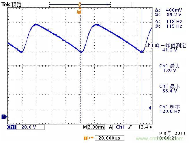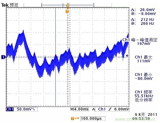 低频纹波是与输出电路的滤波电容容量相关。由于开关电源体积的限制,电解电容的容量不可能无限制地增加,导致输出低频纹波的残留,该输出纹波频率随整流电路方式的不同而不同。