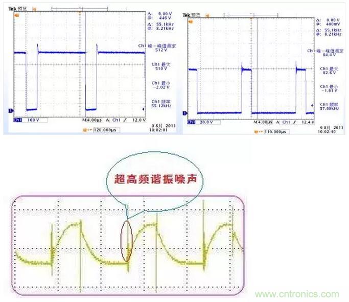 超高频谐振噪声主要来源于高频整流二极管反向恢复时二极管结电容、功率器件开关时功率器件结电容与线路寄生电感的谐振,频率一般为1~10MHz,通过选用软恢复特性二极管、结电容小的开关管和减少布线长度等措施可以减少超高频谐振噪声。