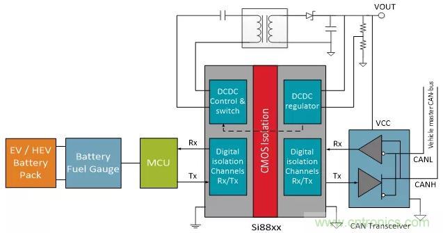 如图3所示,这个简化的BMS系统展示了在与一个EV子系统进行连接时信号和电源隔离的重要性。在大多数EV子系统中,CAN总线通过数字隔离与该子系统中的高压隔离。现代数字隔离两侧各需要一个电源为隔离器供电(高压域和低压域)。该电源也可为连接到隔离器的其他设备供电,例如CAN总线收发器。