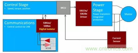 这些系统需要在马达控制器和功率晶体管之间采用隔离驱动器。隔离允许低压控制器安全地开关高功率晶体管以产生交流波形。此外,马达控制系统中可能存在隔离的CAN总线,并且有某些方法可以感测驱动马达的电流,以监控速度和转矩。图4展示了一个使用一系列数字隔离设备的简化的牵引马达控制系统。