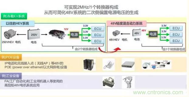 其中,一次电源主要是从48V或12V降到5V或3V,用于车载导航等。二次电源是从5V降到1.25到1V,用于ADAS(高级驾驶员辅助系统)等,未来的技术趋势是更小封装,开发高附加价值的电源IC。