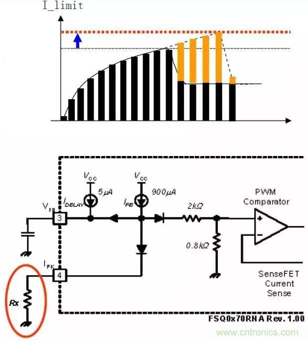 1)增大峰值电流限流点I_limit,可允许流过更大电感电流Id:将与Pin4相接的电阻增大,从内部电流源Ifb分流更小,使作为电流限制参考电压的PWM比较器正输入端的电压将上升,即允许更大的电流通过MOSFET/变压器,可以提供更大的能量。