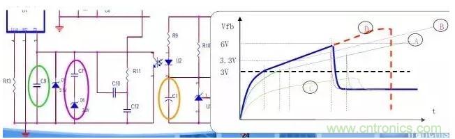 B.由于A方法有不足,将一个电容(C7)串连稳压管(D6,3.3V)并联到反馈脚。此法不会影响正常工作,如B线所示,当Vfb<3.3V时,稳压管不会导通,分流。上升3.3V时,稳压管进入稳压状态,电容C7开始充电分流,减小后续Vfb的上升斜率。C。在431的K-A端并联一个电容(C11),电源启动时,C11电压较低,并由光耦二极管和431的偏置电阻R10进行充电。这样光耦就有较大电流通过,使光耦光敏管阻抗较低而分流,Vfb将缓慢上升,如C线所示。R10×C11影响充电时间,也就影响输出的上升时间。