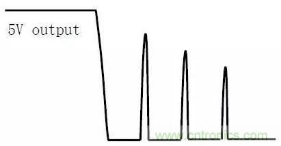 在输出空载或轻载时,关闭输入电压,输出(如5V)可能会出现如下图所示的电压反跳的波形。