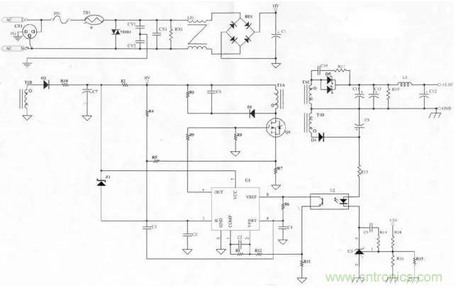 【导读】以下是高手分享电源原理图及每个元件的功能详解。首先,变压器是整个电源供应器的重要核心,所以变压器的计算及验证是很重要的。滤波电容的决定,可以决定电容器上的Vin(min),滤波电容越大,Vin(win)越高,可以做较大瓦数的Power,但相对价格亦较高。