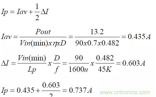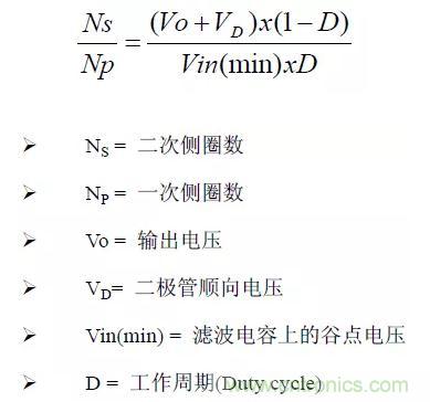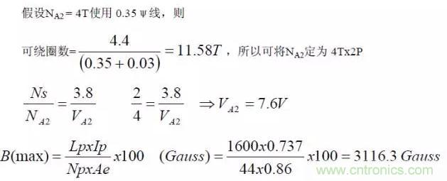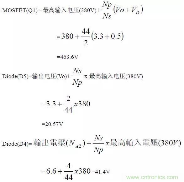 依据变压器的圈比关系,可以初步计算出变压器的应力(Stress)是否符合选用零件的规格,计算时以输入电压264V(电容器上为380V)为基准。