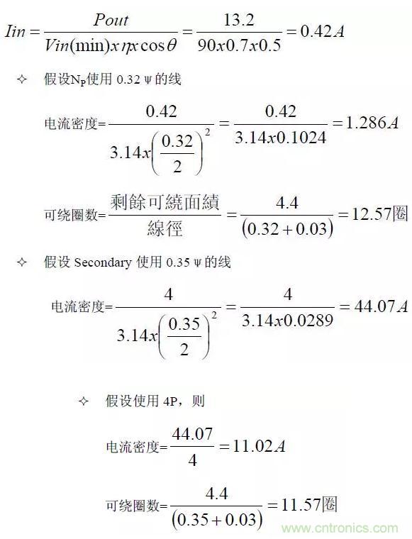 当变压器决定后,变压器的Bobbin即可决定,依据Bobbin的槽宽,可决定变压器的线径及线数,亦可计算出线径的电流密度,电流密度一般以6A/mm2为参考,电流密度对变压器的设计而言,只能当做参考值,最终应以温升记录为准。