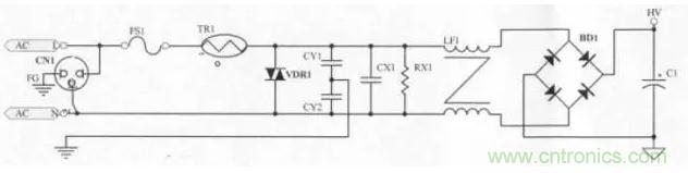Y-Cap一般可分为Y1及Y2电容,若AC Input有FG(3 Pin)一般使用Y2- Cap , AC Input若为2Pin(只有L,N)一般使用Y1-Cap,Y1与Y2的差异,除了价格外(Y1较昂贵),绝缘等级及耐压亦不同(Y1称为双重绝缘,绝缘耐压约为Y2的两倍,且在电容的本体上会有“回”符号或注明Y1),此电路因为有FG所以使用Y2-Cap,Y-Cap会影响EMI特性,一般而言越大越好,但须考虑漏电及价格问题,漏电(Leakage Current )必须符合安规须求(3Pin公司标准为750uA max)。