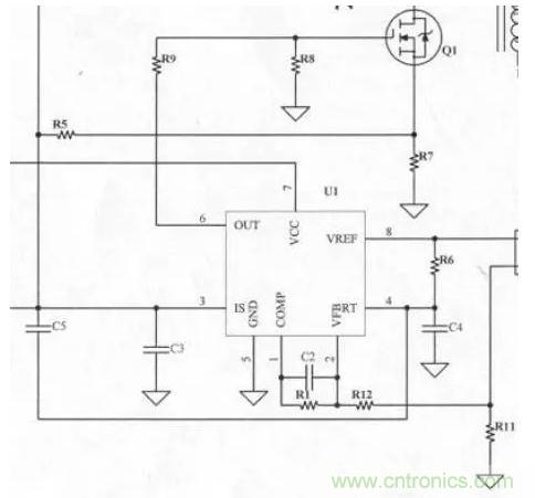 R9电阻的大小,会影响到EMI及温升特性,一般而言阻值大,Q1 turn on / turn off的速度较慢,EMI特性较好,但Q1的温升较高、效率较低(主要是因为turn off速度较慢);若阻值较小, Q1 turn on / turn off的速度较快,Q1温升较低、效率较高,但EMI较差,一般使用51Ω-150Ω 1/8W。