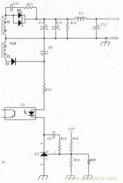 因为输出为3.3V,而TL431的Vref值为2.5V,若再加上photo coupler上的压降约1.2V,将使得输出电压无法推动Photo coupler及TL431,所以必须另外增加一组线圈提供回授路径所需的电压。