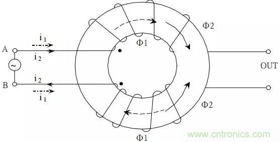 如图所示,在同一磁环上绕上两组方向相反的线圈,据右手螺旋管定则可知,当在输入端A、B两端加上极性相反,信号幅值相同的差模电压时,有实线所示的电流i2,在磁芯中产生实线所示的磁通Φ2,只要保证两绕组完全对称,则磁芯中两不同方向之磁通相互抵消。总磁通为零,线圈电感几乎为零,对常模信号无阻抗作用。若在输入端A、B两端加上极性相同,幅值相等的共模信号时,有虚线所示的电流i1,在磁芯中产生虚线所示的磁通Φ1,则磁芯中磁通有相同的方向而互相加强,使每一线圈的电感值为单独存在时的两倍,而XL =ωL,因此,此一绕法的线圈对共模干扰有很强的抑制作用。