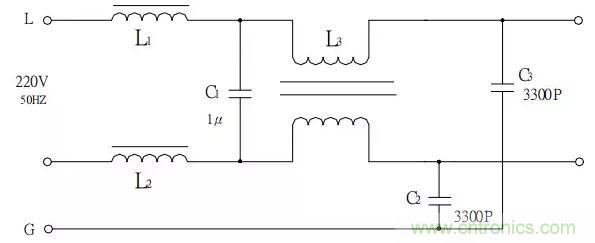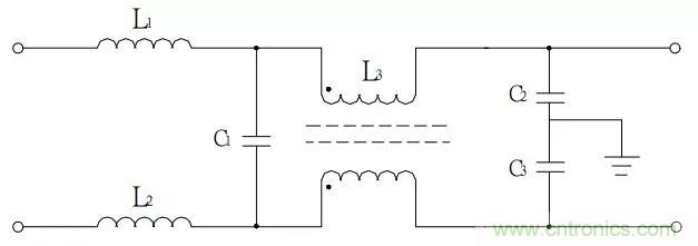图中L1、L2、C1构成常模滤波器,L3、C2、C3构成共模滤波器。