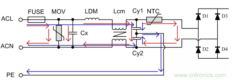 对ACL与ACN之间施加的浪涌电压称为差模浪涌电压,差模路径如图中红线所示;对ACL(或ACN)与PE之间施加的电压称为共模浪涌电压,共模路径如图中蓝线所示。