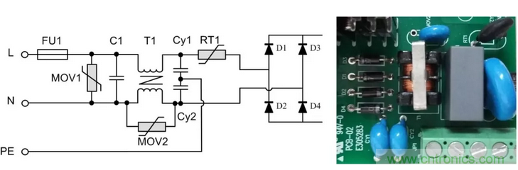背景:以某型号的电源??槲?,该??槭荶LG致远电子为某客户定制的电源???,输入85VAC~350VAC,且EMC前级电路电路嵌入到??橹小?估擞恳蟛钅5缪?KV,共模电压6KV。更换更大的保险丝后可承受6KV差模电压。其前级原理图及对应实物图如图2所示。