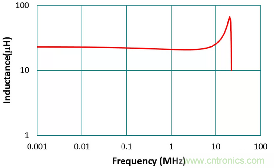 电感器之电感值在电路设计时为最重要的基本参数,但必须看在工作频率下此电感值是否稳定。电感的标称值通常是在没有外加直流偏置的条件下,以100 kHz 或1 MHz 所量得。且为确保大量自动化生产的可能性,电感之容差值(tolerance)通常是 ±20%(M)与±30%(N)居多。图3为利用表量测 电感220M 之电感-频率特性图,如图所示,在5 MHz 之前电感值的曲线较为平坦,电感值几乎可视为常数。在高频段因寄生电容与电感所产生的谐振,电感值会上升,此谐振频率称为自我谐振频率,通常需远高于工作频率。
