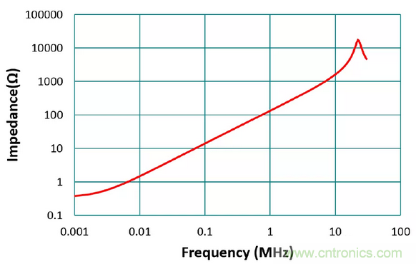如图4,从阻抗图也可以看出电感在不同频率下的表现。电感的阻抗约与频率成正比(Z=2πfL),因此频率愈高,电抗会比交流电阻大很多,所以阻抗表现就如同纯电感(相位为90?)。而再往高频,由于寄生电容效应,可以看到阻抗的自我谐振频率点,过了此点阻抗下降呈现电容性,且相位逐渐转为-90 ?。