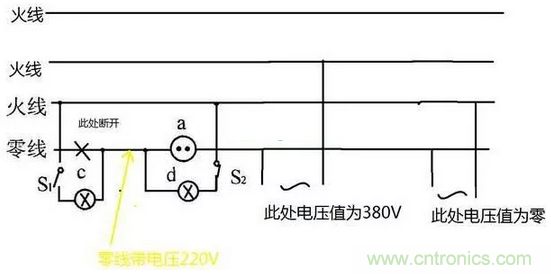 给出草图当零线断开时,如过上端负载有未断开的情况,如图S2闭合的情况火线与零线通过负载的线圈串联到了一起,那么零线就是和火线带一样的电压值。你家里的零线如果是从断点后端接出来的,电压值如上图两种情况380V或者零伏。