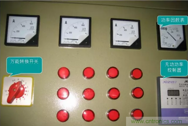 三个电流表A、一个功率因数表COS;功率控制器PK;万能转换开关