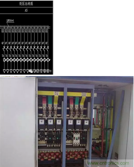 每组出线有:一个电流表;一个塑壳断路器;一个电流互感器