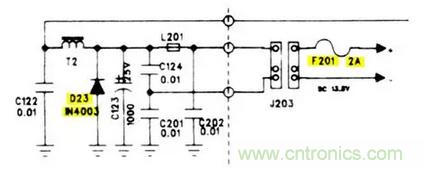 收音机的设计中电源部分有一个二极管,其功能是提供反向?;??;旧?,如果你把收音机电源极性接错了,二极管就会导通(D23),并且熔断电源线上2安培的保险丝(F201)。这是一个非常典型的电源供电电路。