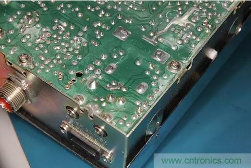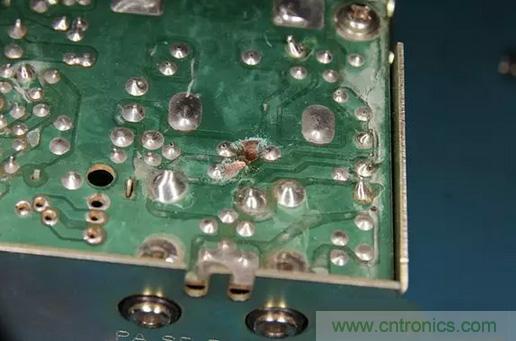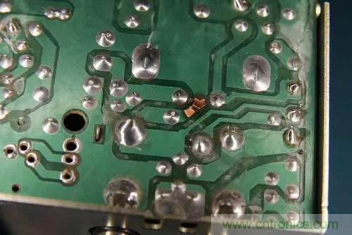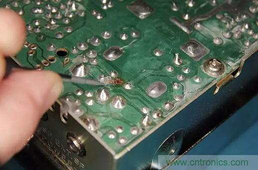 很自然地,保险丝会熔断,但大家又不总是会用相同额定电流的保险丝来替换。通常情况下,他们会用更高额定电流的保险丝来做替换。所以,当收音机仍然反向连接电源,就会出现保险丝没有熔断,PCB电路板上走线有烧断的现象。如下图所示。
