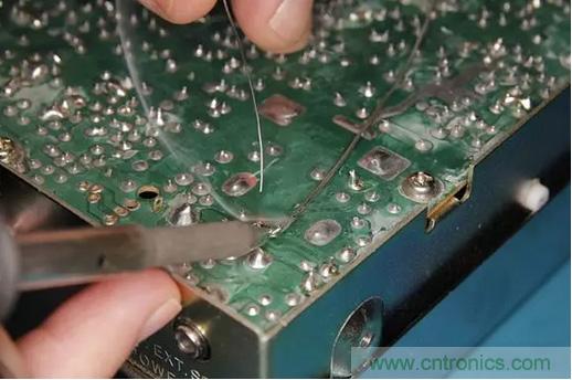 接着焊接导线的另一个端点到PCB断开走线对应的另一个焊点上。