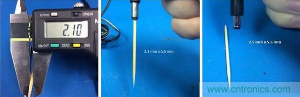显然,用一把尺子或者游标卡尺(如果手边有的话)来准确测量或辨别2.1mm或者2.5mm的小孔内径是很难的。这就留给我们两个选择: