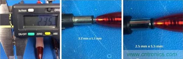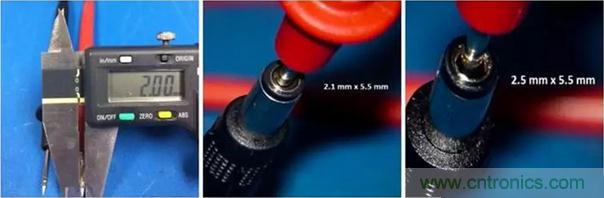 这个技巧有点小窍门。大多数测试探针你会发现其直径都是2mm的,这也就意味着,2.1mm和2.5mm内径的接头都可以插进去。所以,就需要观察一下探针和孔洞内壁间是否有明显缝隙。测试探针插入2.1mm接头时孔洞内壁和测试表笔头间无明显间隙,但2.5mm接头和测试笔头就有明显缝隙。