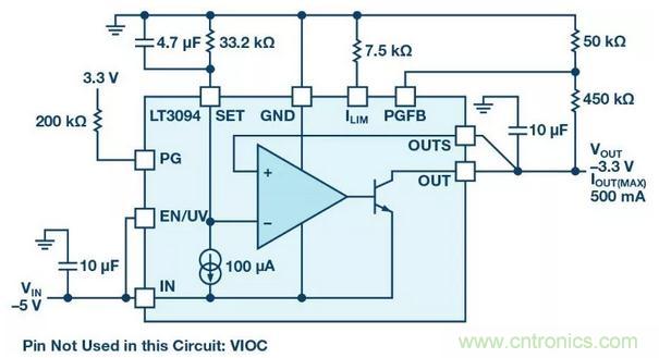 LT3094采用小尺寸、低成本的10μF陶瓷输出电容工作,可优化稳定性和瞬态响应。利用单个电阻器可编程外部精密电流限值(±10%过温)。该器件的VIOC引脚可控制前端稳压器,以最大限度地降低功耗并优化PSRR。单个SET引脚电容可降低输出噪声,并提供基准软启动功能,防止输出电压在开启时过冲。此外,该器件的内部?;さ缏坊拱ň哂姓鄯倒δ艿哪诓肯蘖骱痛僦偷娜裙?。其他功能包括快速启动功能(如果使用的SET引脚电容值较大,则非常有用)和电源良好标志(业界首款具有此功能的负输出LDO稳压器),具有可编程阈值,用于指示输出电压调节。