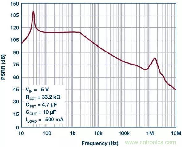客户使用运算放大器、ADC或其他信号链元件还将面临另一个系统性能的难题:这些IC的电源抑制能力有限,更糟糕的是,高频时的电源抑制能力可能会显著降低。在过去,这意味着需要在电路板上使用额外的滤波元件,但这会增加解决方案的尺寸。此外,如果设计人员试图获得更高的精度,一旦稳压器电源噪声过高,则可能产生更多麻烦,这会导致测量场景出现不希望的变化。