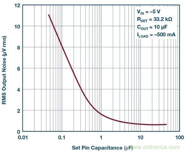 LT3094需要一个输出电容才能保持稳定性。鉴于其高带宽,建议使用低ESR和ESL的陶瓷电容。为达到稳定性,要求输出电容最小值为10μF,ESR小于30mΩ,ESL小于1.5 nH。由于使用单个10μF陶瓷输出电容可获得高PSRR、低噪声性能,而较大的输出电容值仅仅略微提高了性能,因为稳压器带宽随着输出电容的增加而降低,因此,使用比最小输出电容值10μF更大的输出电容并不会获得多大的收益。尽管如此,较大的输出电容值确实会降低负载瞬变期间的峰值输出偏差。