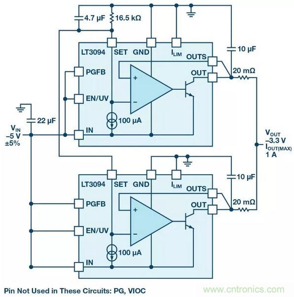 并联多个LT3094可获得更高的输出电流。将所有SET引脚和所有IN引脚并在一起。使用小尺寸的PCB走线(用作镇流电阻)将OUT引脚连接在一起,以均衡LT3094中的电流。也可以将两个以上的LT3094进行并联,实现更高的输出电流和更低的输出噪声。输出噪声的降低与并联器件数的平方根成比例。并联多个LT3094对于在PCB上散热也很有用。对于具有高输入至输出电压差的应用,也可以使用一个输入串联电阻或与LT3094并联的电阻进行散热。图4所示为并联电路实现方案。