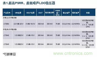 表1所示为ADI的超高PSRR、超低噪声系列LDO稳压器的产品成员。