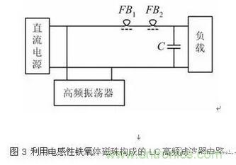 由于铁氧体磁珠在电路中使用能够增加高频损耗而又不引入直流损耗,而且体积小、便于安装在区间的引线或者导线上,对于1MHz以上的噪声信号抑制效果十分明显,因此可用作高频电路的去耦、滤波以及寄生振荡的抑制等。特别对消除电路内部由开关器件引起的电流突变和滤波电源线或其它导线引入电路的高频噪声干扰效果明显。低阻抗的供电回路、谐振电路、丙类功率放大器以及可控硅开关电路等,使用铁氧体磁珠进行滤波都是十分有效的。铁氧体磁珠一般可以分为电阻性和电感性两类,使用时可以根据需要选取。单个磁珠的阻抗一般为十至几百欧姆,应用时如果一个衰减量不够时可以用多个磁珠串联使用,但是通常三个以上时效果就不会再明显增加了[7]。如图3示出了利用两只电感性铁氧体磁珠构成的高频LC滤波器电路,该电路可有效的吸收由高频振荡器产生的振荡信号而不致窜入负载,并且不降低负载上的直流电压。