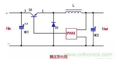 如下图为降压型电路。在此电路中,脉宽调制(pwm)电路的输出加到晶体管开关Q1的基极,以控制其导通和截止。