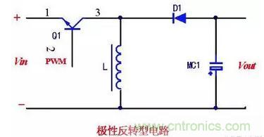 如下图为极性反转型电路,也叫倒置型电路。当Q1导通时,uin加在l两端,产生电流和储存能量。Q1截止后,l上的电流经二极管D1给电容器MC1充电。由此产生与输人电压极性相反的输出电压。