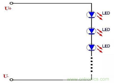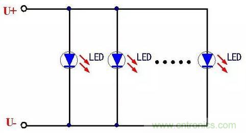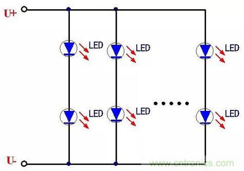 这种串联连接的方式电路比较简单,首尾连接在一起,LED工作时流过的电流一致很好,由于LED属于电流型器件,因此基本可以保证每个LED的发光强度一致。采取这种LED连接方式的电路简单、连接方便。但是也有一个致命的缺点,那就是当其中一个LED发生开路故障时,将造成整个LED灯串的熄灭,影响了使用的可靠性,这就需要保证每个LED的质量过硬,这样可靠性也就相应的提高。