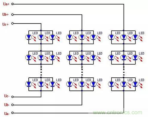阵列方式主要构成形式是:分支以3个LED为一组,分别接入驱动器输出的Ua,Ub,Uc输出端。当一分支中的3个LED都正常时,3个LED同时发光;一旦其中有一个或两个LED失效开路时,可以保证至少有一个LED的正常工作。这样一来就能够大大地提高了每组LED发光的可靠性,也就能够提高整个LED发光的总体可靠性。采用这种方式需要多组输入电源,目的是为了提高LED 工作的可靠性,降低整体电路故障发生率。
