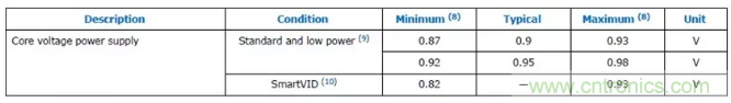图1:Arria 10 FPGA内核电压要求 (来源: Intel®Arria® 10 器件数据表)