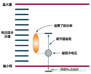 问题是大多数电源调节器都不够准确。调节电压可以在被指令电压附近的公差范围内的任何地方,并且它可以随负载条件、温度和老化而漂移。±2%容差的电源即表示可以在4%的电压范围内输出任何值。为了补偿电压处于2%过低的可能性,被指令电压必须比满足时序所需的电压提高2%。如果经过调节器后电压漂移到高于被指令电压2%处,它将比该工作点所需的最小电压运行高4%。这仍然符合规定的FPGA所需的电压要求,却浪费了大量功率,如下图2所示。