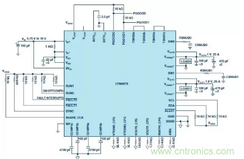FPGA系统中的器件通常需要不同调节电压,例如电压的内核电压处理器,其要求电压可以是0.8V、1.0V、1.2V、1.5V或1.8V等。虽然是低电压供应,但其密集的晶体管结构及长期保持高速运作的情况下,供电电源方案可能需要10A或以上,具体的处理器要求通常决定了其他电源要求,例如负载瞬态恢复、待机模式等,这需要负载点(Point-of-Load,或简称PoL)稳压电源专为核心电压设计。 PoL稳压电源是一种高性能稳压器,其各Vout电压轨独立于各自的负载设置。这有助于解决高瞬态电流的要求以及诸如FPGA高性能半导体器件的低噪声要求。例如ADI 公司的LTM4678系列,包含两组能够同时提供高密度的电源供应输出,分别为1V@25A 及1.8V@25V。