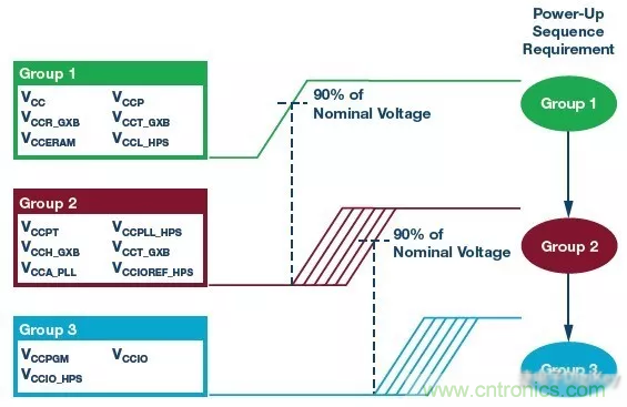 市场中较新的FPGA在规格中会提供针对启动和关断电源时的序列顺序提出特定的要求,确保FPGA正??艏案次?,保持最小的电流消耗,并在电源转换期间将I/O保持在正确的三态配置下。再以Arria 10为例,其技术规格将电源分为三个序列组(1、2、3),并要求它们按升序排列为1、2、3,然后按相反的顺序降序排列:3、 2、1。