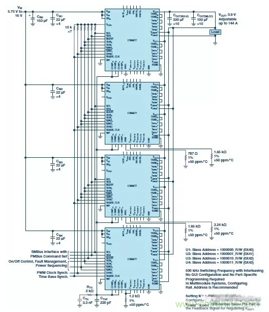 在套件中,内核电源的工作电压为0.95V,工作电流为30A。由于这些电源要求相对宽松,单个LTM4677??榫涂汕崴商峁┧璧缌鳎ㄗ罡?6A)。对于要求更多电流且条件更为苛刻的应用,最多可以并行运行四个LTM4677???,以提供高达144A的电流,如图7所示。
