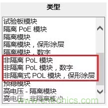 为方便工程师选料,Digi-Key官网上的「电源 - 板安装」分类中的「直流转换器」子分类中,在「类型」中已将PoL产品列出,方便工程师更快更准确地选料。