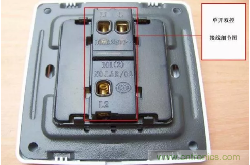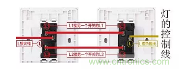 单控开关每组二个接线孔L接火线L1接灯控制线。双控开关每组三个接线孔L接火线或灯控制线,L1丶L2接二根双控回路线。