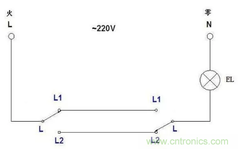 大家看这个接法,两个单联双控的L1连一起接灯的控制线,两个L2连一起接的是火线,灯接零线。这种接法也是很安全的,唯一的缺点就是费线。