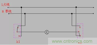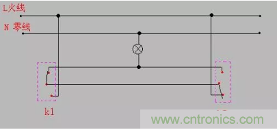 例如:进门与床头的开关共同控制卧室的一盏灯,楼上与楼下的开关共同控制楼梯的灯,都是用的一开双控开关。