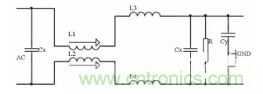 图4是220V/50Hz交流输入的开关电源交流侧EMI滤波器的电路。Cy=3300pF,L1、L2=0.7mH,它们构成共模滤波电路,抑制0.5~30MHz的共模干扰信号。Cx=0.1μF,L3、L4=200~500μH,采用金属粉压磁芯,与L1/L2、Cx构成L-N端口间低通滤波器,用于抑制电源线上存在的0.15~ 0.5MHz差模干扰信号。R用于消除可能在滤波器中出现的静电积累。