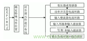 敏感线路主要是指控制电路和直接与干扰测量设备相连的线路。要降低干扰水平,最简单的方法就是增大干扰源与敏感线路的间距。但由于受电源尺寸的限制,单纯的增大间距并非解决问题的最佳途径,更为合理的方法是根据干扰电场的分布情况将敏感线路放在干扰较弱的地方。PCB抗干扰布局设计流程如图6所示。