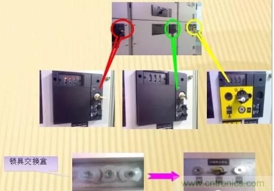 当需要断开出线柜时,先将N电源柜、E电源柜停电,拔出KEY1、KEY2钥匙,然后将钥匙插入锁具交换盒里,取出KEY3钥匙插入出线柜联锁的钥匙孔,方能操作出线柜。合出线柜的操作步骤则相反。